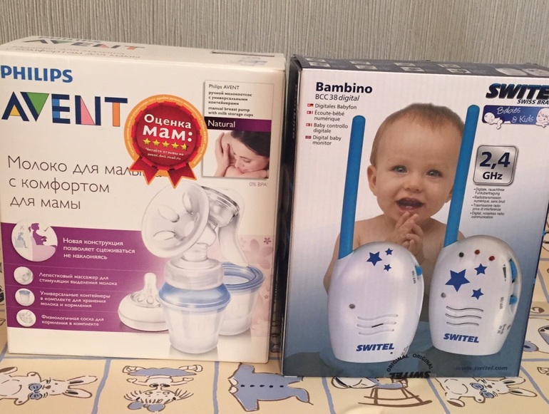 9. Молокоотсос ручной от avent и радионяня от фирмы switel.
