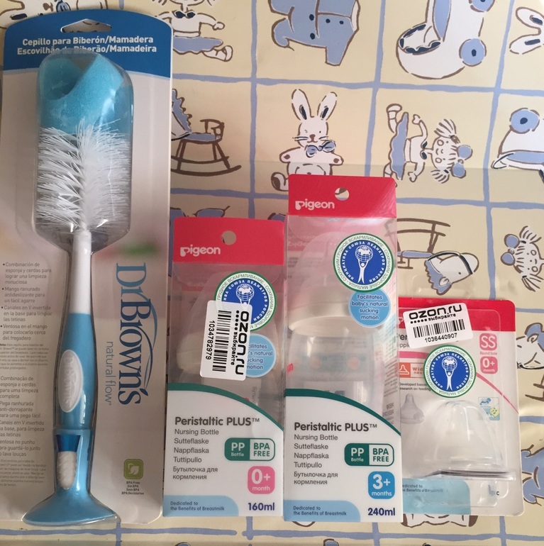 15. Бутылочки от фирмы pigeon, купила две бутылочки пока от 0+ и от 3+, приобрела запасные соски на бутылочки, так же щеточку для мытья бутылочек от dr.brown's