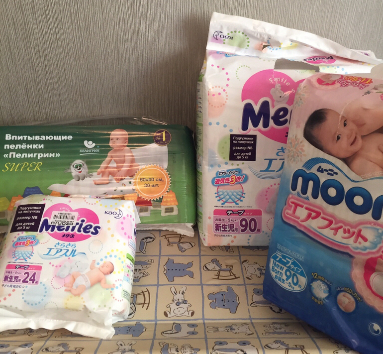 Подгузники до 4,5 кг, купила на первое время две пачки от меррис и мун. Купила для сравнения две пачки разной фирмы и постоимости они тоже разные, разница в рублей 250-300