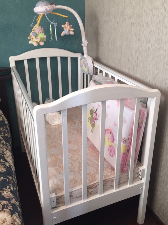 1. Кроватка. Сыну кроватку покупали еще 7 лет назад Гандылян с маятником и ящиком для белья. Маятником и ящиком не пользовались вообще. В итоге для дочки выбирали кроватку без маятника и без ящиков лишних в белом цвете, ездили по разным магазинам, выбирали и вовремя вспомнили, что у нас на даче все еще хранится старая кроватка сына. В итоге привезли ее домой и облагородили: отмыли, разобрали механизм с маятником и выкинули ящик для белья, покрасили кроватку акриловой краской в белый матовый цвет. В итоге сэкономили около 6000 руб:)