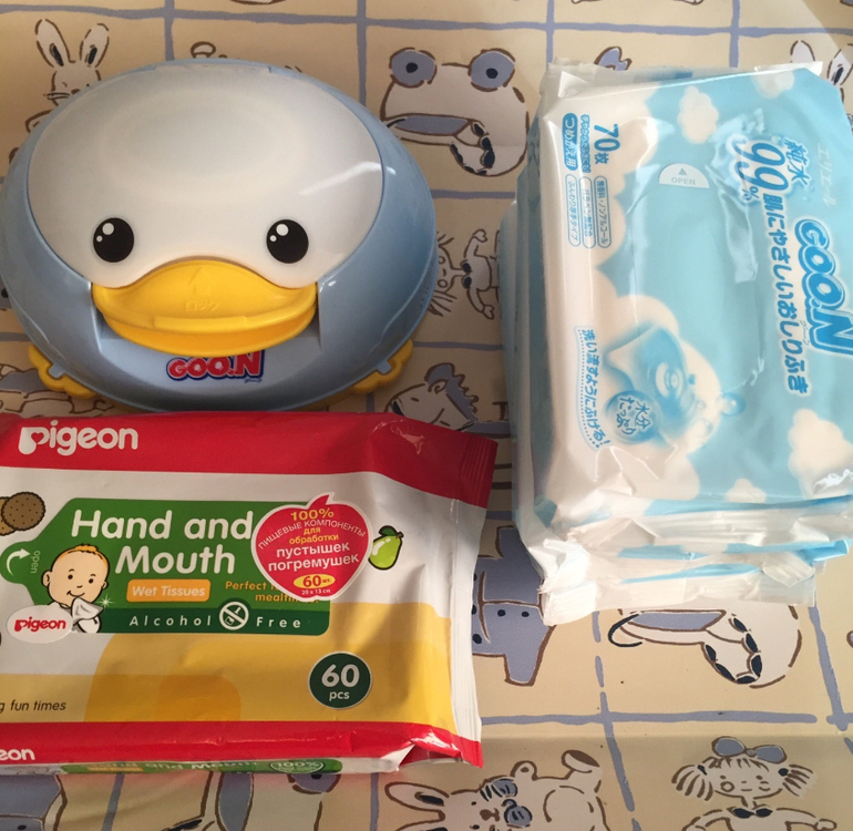 17. Влажные салфетки от Goon и контейнер к ним же( это сын попросил купить для сестренки-уж больно контейнер понравился) и pigeon - этими салфетками можно соску вытерать, если упала. С сыном пользовались салфетками от huggies без отдушки, мне нравились. Возможно с дочей, в будущем на них снова перейду.