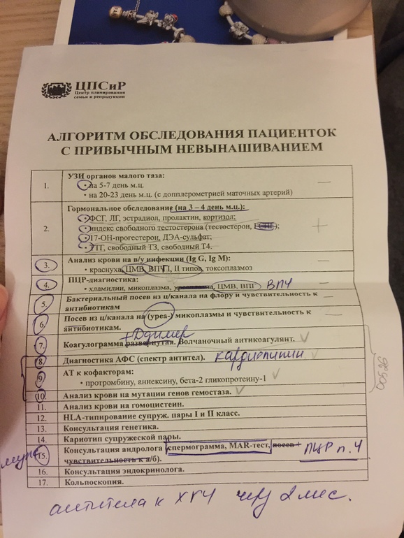 Вот могу вам фото прикрепить, что мне сказали проверить после одной замершей (все что обведено ручкой). И ткани плода возили на цитогенетический анализ, чтобы исключить генетику