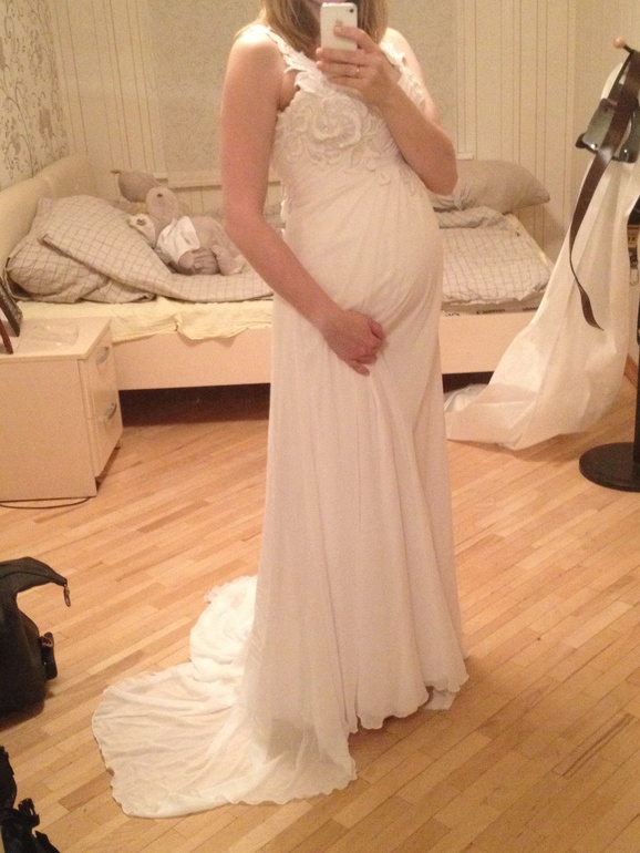 А вот мое платье. Еле застегнула! На свадьбе животика почти не было видно