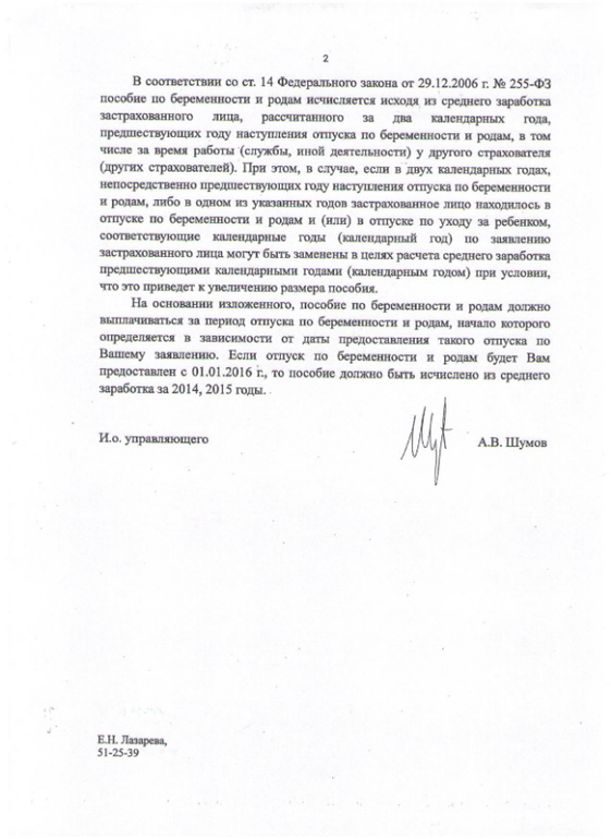 Очень меня волновал вопрос, могу ли я написать заявление на отпуск по БиР с 01.01.16 г. и получить расчет пособия по 2014-2015 гг, если больничный лист будет мне выдан с конца декабря (январем 100% не выдадут). В инете инфа разноречивая, больше попадалось вариантов, что могу. Другие писали, что могу, но в расчет все равно 2013-2014 гг. пойдут. Бухгалтерия на работе намекала, что нефиг, а вдруг будут проблемы у них. В общем, я написала обращение в ФСС и, наконец, получила официальный ответ! Ура! (скан под катом)
