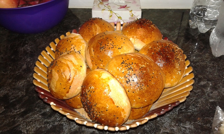 Тесто поставила на замес так как руками сейчас трудно мне. Потом вынула, сделала шарики маленькие и оставила на 3 часа. Они виростают в раз. Потом смазала яйцом и насыпала белым и чёрным кунджутом. И всё в духовку на высокую температуру. До румянецы...