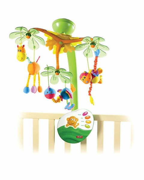 Фишер прайс с звериками( друзья тропического леса) вот такой http://www.detmir.ru/product/index/id/246951/ Там два режима, спокойная музыка и повеселей и два режима громкости. Сейчас сам мобиль сняли, а слоненком и музыкой до сих пор иногда ребенок развлекается (1,3) :) Он кстати очень удобен тем что его можно не только повесить на кроватку, но и поставить.