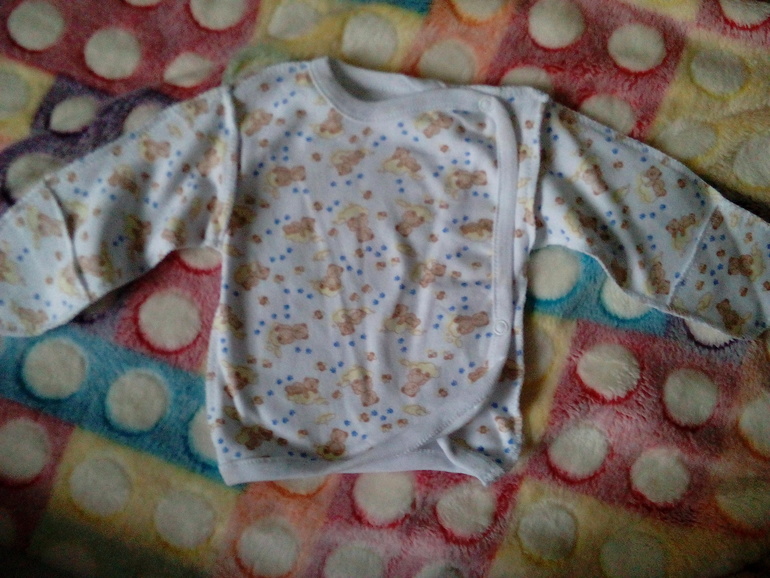 ну и под самый низ такая распашенка и подгузник. Ну и естесственно тонкая шапочка и вязанная. Я сейчас в другом городе у мамы, фото шапочки нет. Как думаете не замерзнет? Или вместо тонкой распашонки и ползунков взять велюровые?