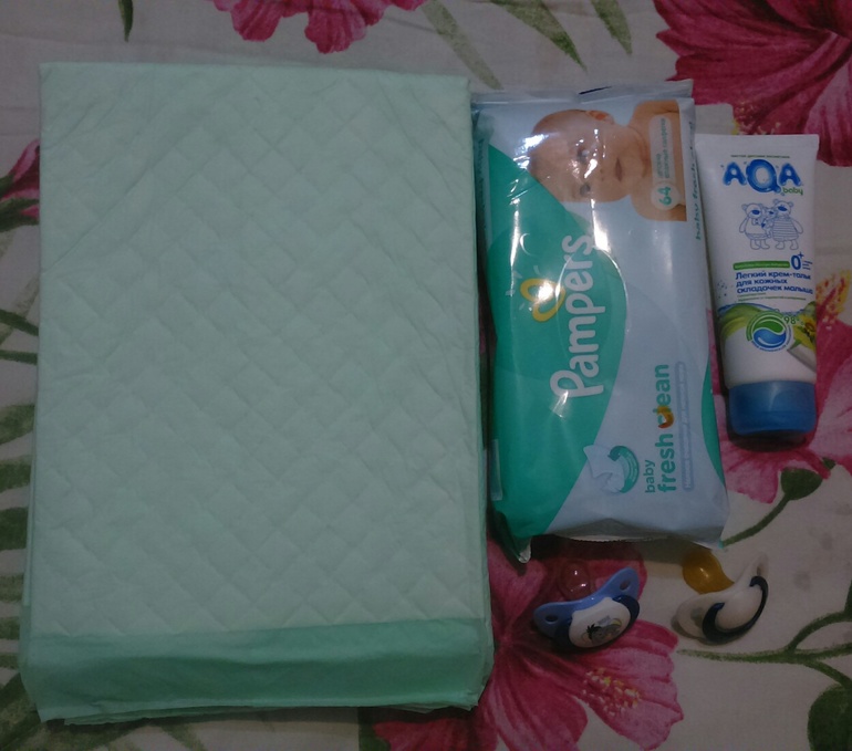 Влажные салфетки, крем под подгузники, соски, пеленки впитывающие . Сюда же положу бепантен и памперсы