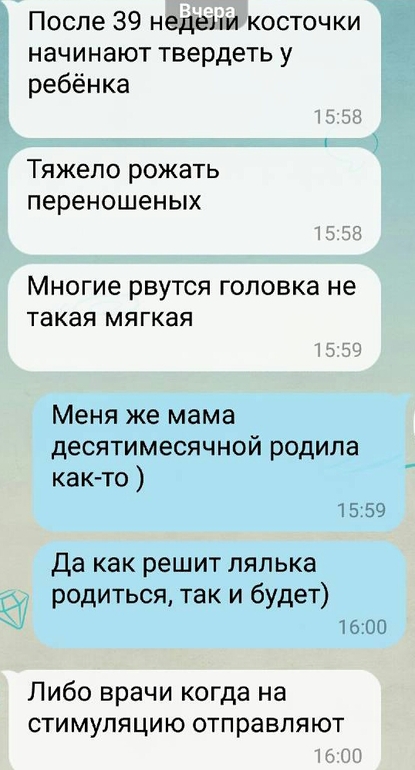 Позавчера ещё сестра мужа писала, задавала стандартные вопросы и даала непрошенные советы. У самой двое детей, неужели сама не понимает как донимают эти все вопросы. Ещё и пугает меня...