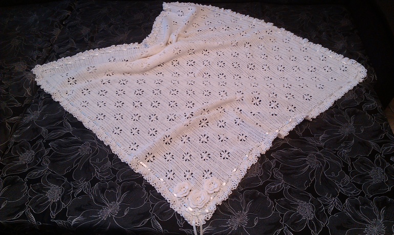 пришивание 160 с лишним бусин на пинетках и продевание почти 5 метров тесьмы в плед - для беременной меня и этого хватило с излишком))) Хотя вязать умею в принципе и спицами и крючком, но увидев готовый плед, лишний раз убедилась, что я б....