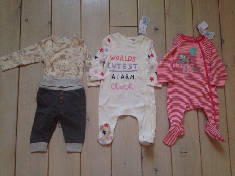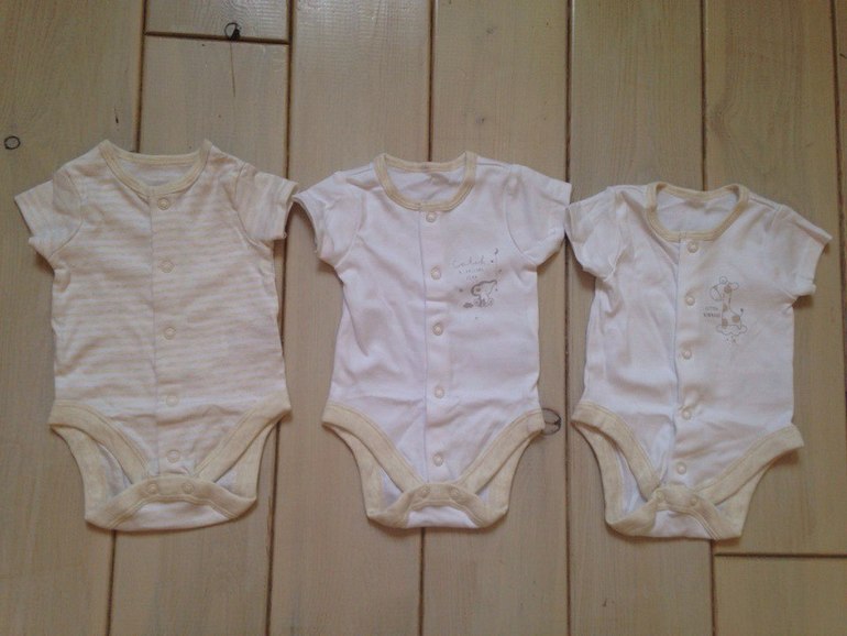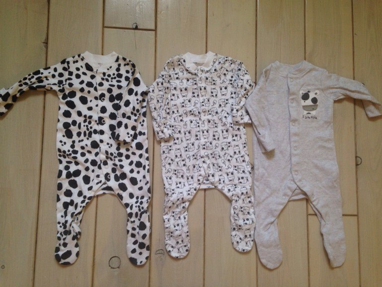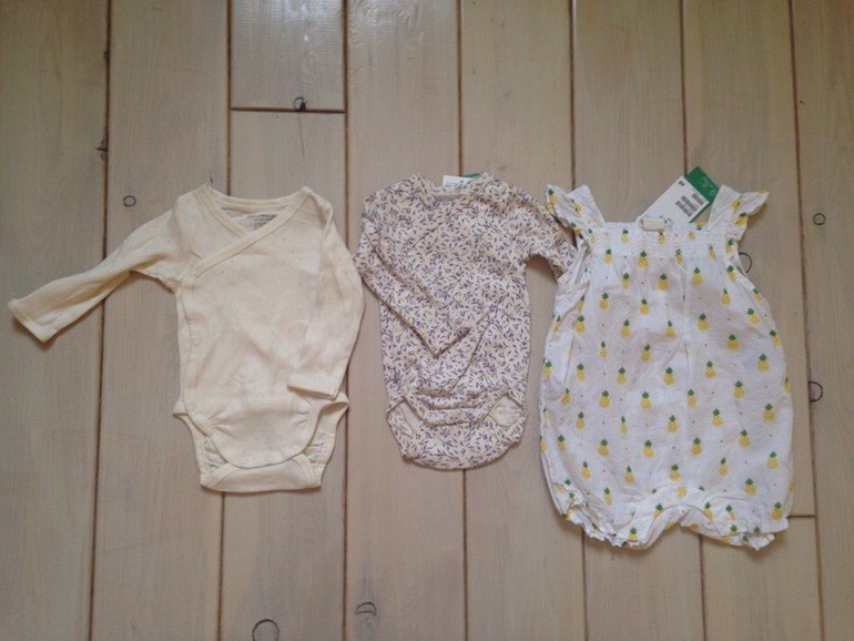 И вот улов этих выходных. С распродажи в HM два боди на 56 см и песочник на лето на 62 см.