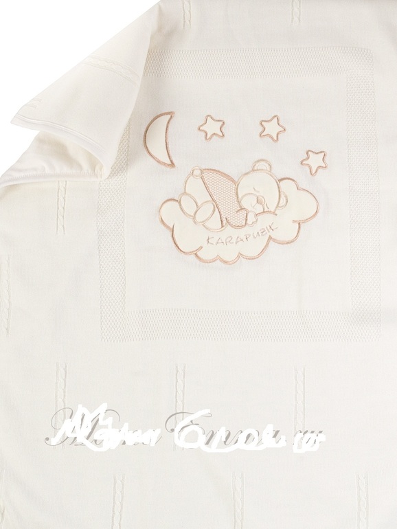 Описание: Вязанный теплый плед для новорожденных хорошо подойдет для прогулки и для дома. Лицевая сторона пледа связана из шерстяной нити. Внутренняя сторона из мягкого хлопка, внутри синтепон.