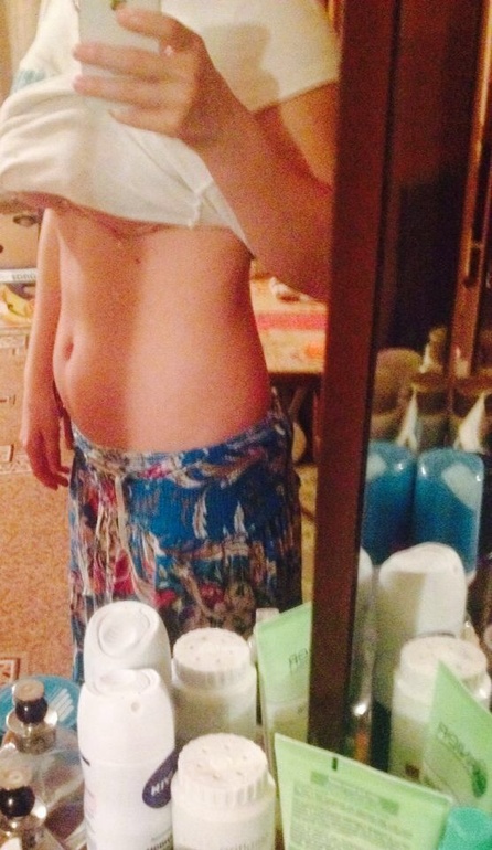 Нет утром чуть меньше животик 😅на тошак конечно😂 Это фотка вечером 😆я просто в шоке у меня до беременности живот был чисто плоским но я весила больше Щас похудела но живот больше почему то )))