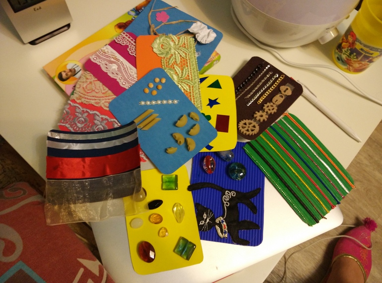 Я наверное паникерша, но все мелкие детали ( камешки и макарошки) я бы в мешочки зашила ( как написала ниже Ирина). Понимаю, что с этими карточками малыш будет играть под вашим наблюдением, но всегда может зазвонить телефон или т.п. а малыши очень быстро все откусывают и в ротик кладут.