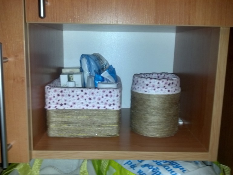 была у меня коробка из под посылки и баночка от маски для волос..покупаете веревку любую какая вам нравится и во круго обклеиваите банку на ПВА, шьете красивые мешочки "вкладыши" и все.