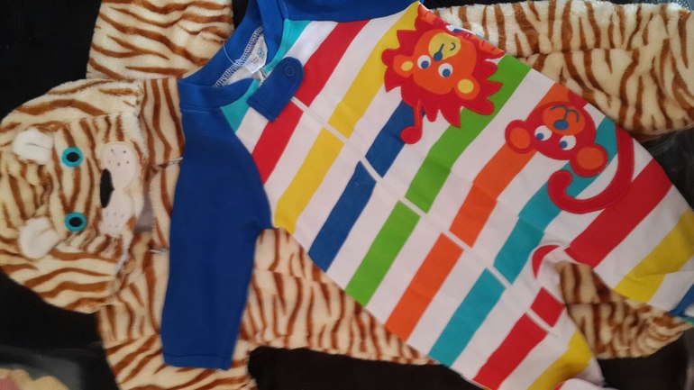 Эти два комбеза купили, когда была распродажа 50% в магазинах Здоровый малыш, поддались ажиотажу))) Знаю, что цветной комбез-это скорее для мальчиков..ну и что,мне понравился, яркий такой, позитивный. Ну и конечно, плюшевый тигра