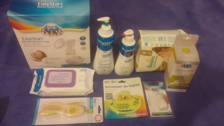 Косметика (Mustella) гель-крем для душа, салфетки мокрые и крем для тела, молокоотсос Cаnpol (очень хвалили на курсах) и бутылочка Cаnpol (антиколики), термометр для воды, щетка для волос, грушка для носа.