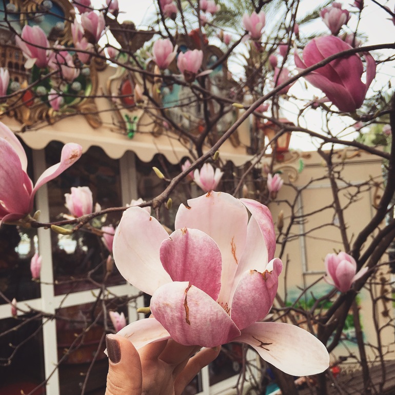 Погоды стоят на улице дивные. Тепло, на деревьях висят гроздья апельсинов и цветут магнолии. Солнечно, но ветер не слабый периодически.