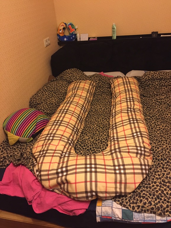 С самого начала Б знала, что закажу ее, т.к. и в обычном своем состоянии обкладываюсь мишками/подушками и закидываю разные части тела на мужа, а с увеличением животика тяга эта только росла. Изначально думала ее сшить, вдохновили пару постов на эту тему, да и вообще, тянет на творчество меня в последнее время. Но посчитав затраты на холлофайбер (даже тут пост создавала на эту тему) и сравнив с ценами готовых подушек, решила не заморачиваться, тем более муж давил с выбором подарка на 8 марта, варианты другие не придумывались, ну в-общем, все сошлось))))