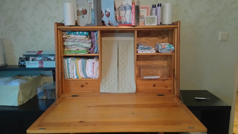 Я считаю третий вариант наиболее удобным для себя. И единственная проблема была такую пеленалку найти. Долго искали, а оказалось что у родственников мужа осталась со старых времен. Вот так это все в итоге выглядит: