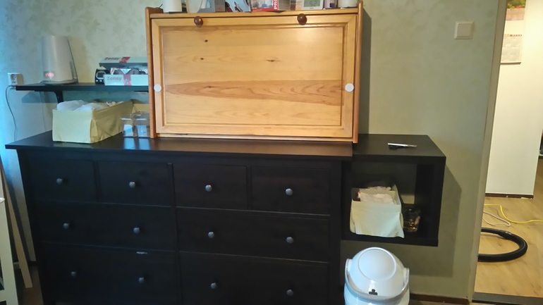 Почему это удобно. Во-первых, со временем пеленалку мы просто уберем, а комод останется комодом. Во-вторых в нашем варианте рабочая поверхность пеленалки большая, больше чем у тех комодов которые я видела (примерно 120 в ширину и 80 в длину). В-третьих внутри удобные шкафчики для самого нужного при переодевании. На пеленалку мы кладем матрасик для пеленания который сделали сами из куска поролона, который обтянули клеенкой. Не то чтобы нельзя было купить, просто опять же те которые мы находили все маленькие. Клеенку кстати можно купить в икее.