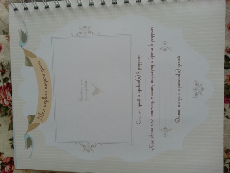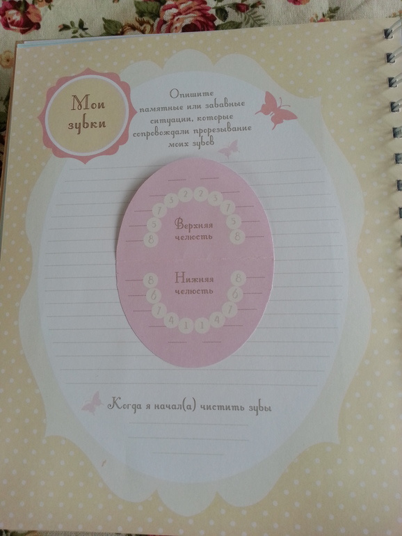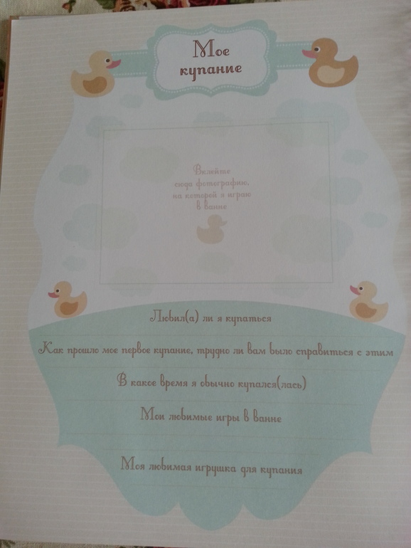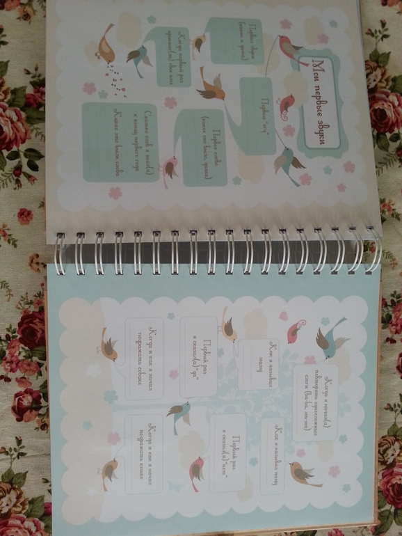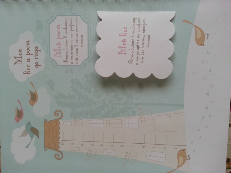 А так же есть семейное древо, пожелания от бабушек с дедушками, любимые сказки и колыбельные, первая погулка, кармашек для бирки из роддома и много страниц в таком стиле..