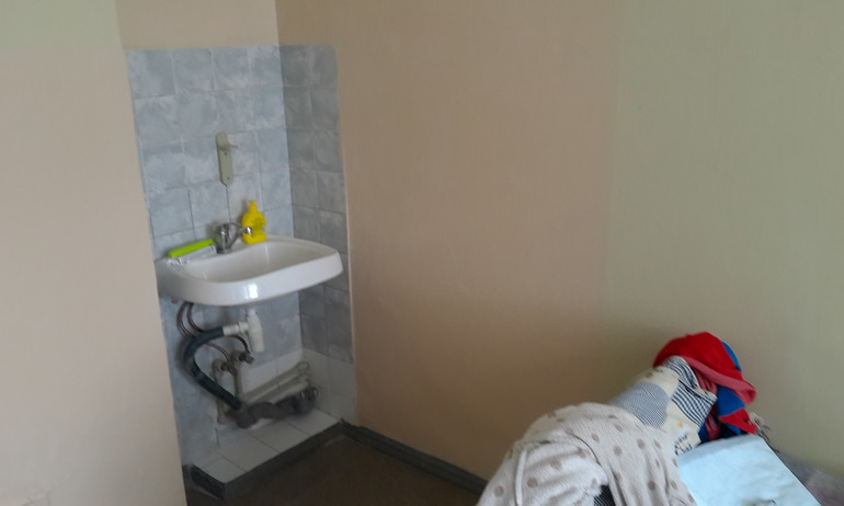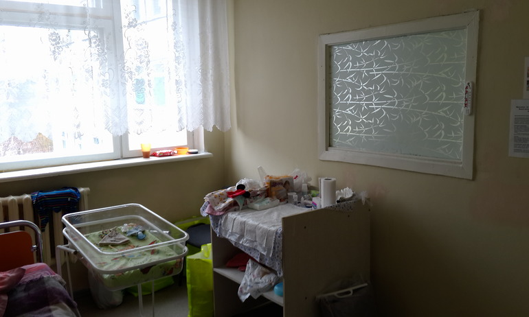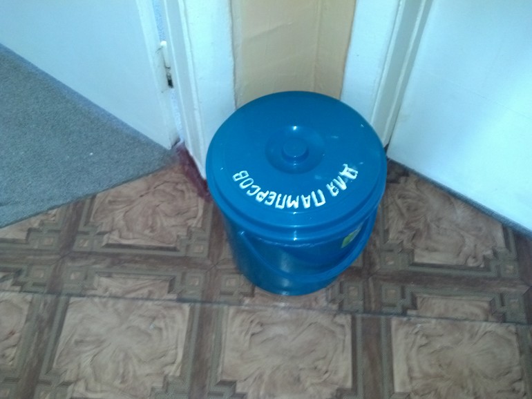 В коридоре на две палаты стоит ведро для использованых памперсов