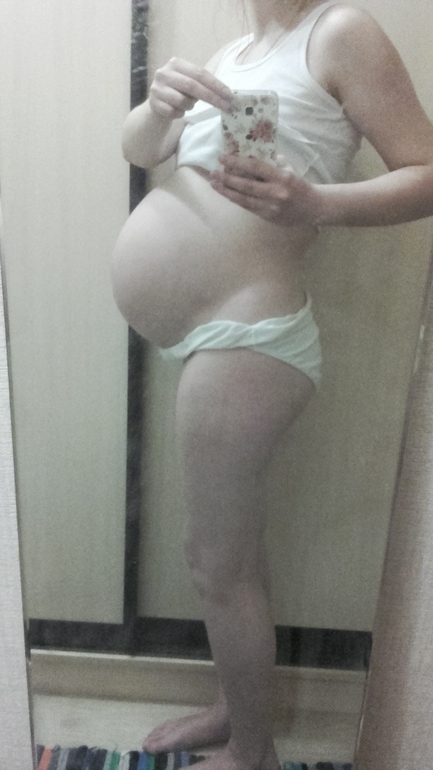 Ну вот мой пузик, на трусы не обращайте внимания, ношу беременные, до пупка, хлопковые. В обычных больно внизу живота.