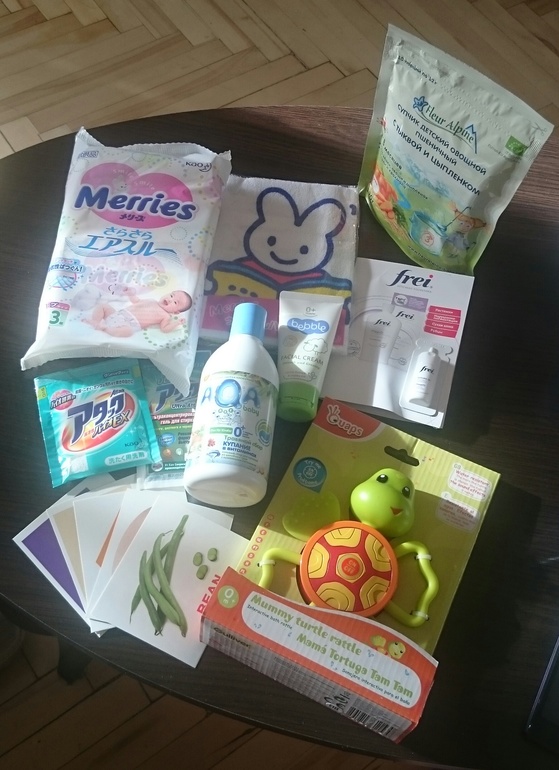 1) Меррис - пробник подгузов в размере S (то есть не на новорожденных, а следующий) + полотенчико-салфетка с зайцем. + Ниже на фото - пробники их порошка и геля для стирки
