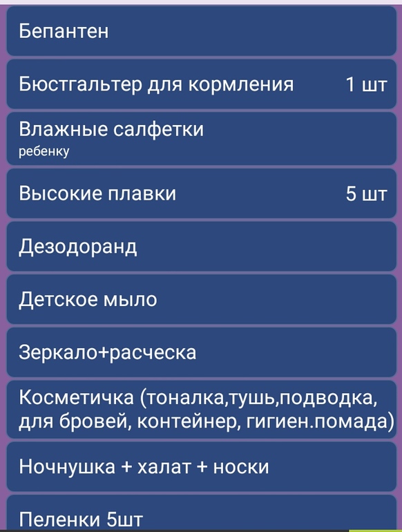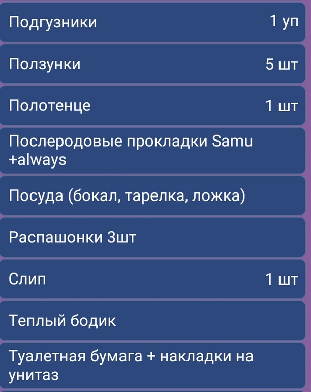 Как по мне то идеальный список! Утащу у вас.. я все думаю что ребенку с собой брать, сумки в принципе собраны, но вот одежда ребенку это моя головная боль. Кто то весь гардероб тащит. Кто то вообще ничего не берёт. Такой вопрос, у вас совместное пребывание с ребенком в палате или только кормление?
