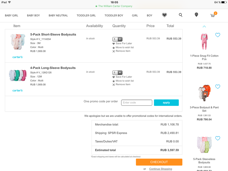 А на Картерс да, сегодня скидки. Заказала сет из 5 бодиков (больше не нужно точно). За 476р. Плюс будет доставка по весу, это примерно 250р за 5шт, то есть выйдет 700р за 5 бодиков. Вы ещё прибавляйте доставку почтой к вам и решайте)))