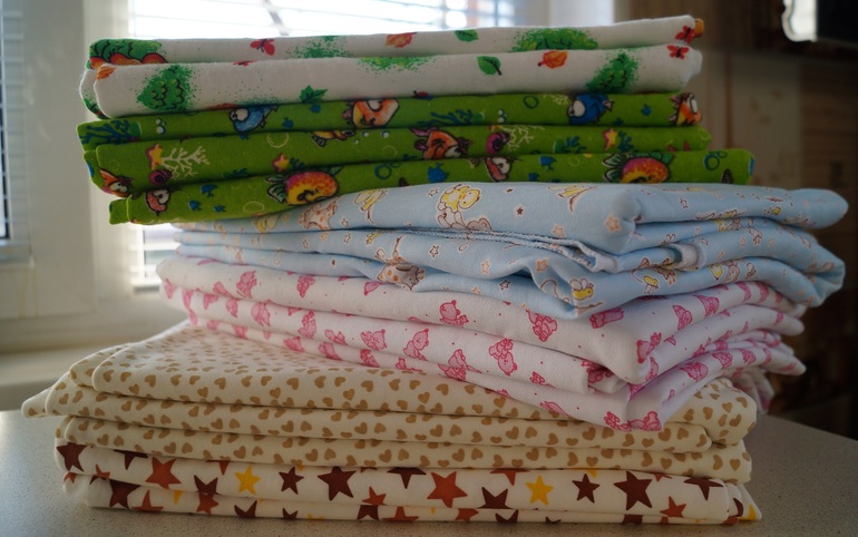 И ещё купила 15 пеленок самого большого размера 90 на 120, по 5 штук интерлок, фланель и футер, ещё планирую 5 штук из бязи взять