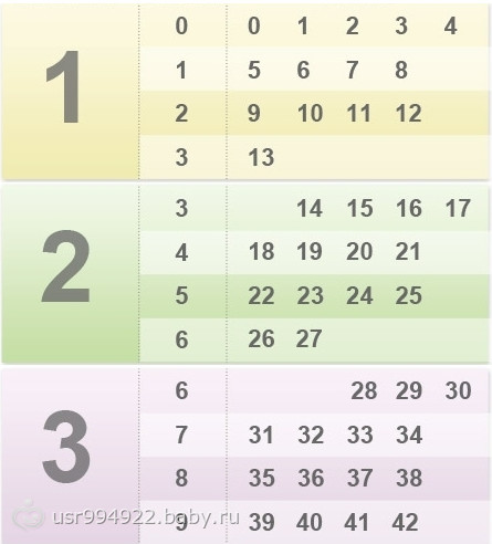 Вы не по табличке, а сами посчитайте, сядьте, распишите все и будет понятно)) думаю с 27 недели