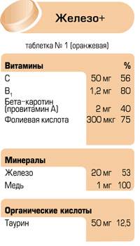 Таблетка «Железо+» содержит железо, которое обеспечивает профилактику анемии; витамин В1, участвующий в энергетическом обмене, фолиевую кислоту и таурин, необходимые для нормального развития плода.