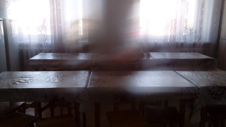 Столовая чистая столы в два ряда.Имеется 4 холодильника,2 микроволновки, шкафчики для хранения вещей и продуктов.