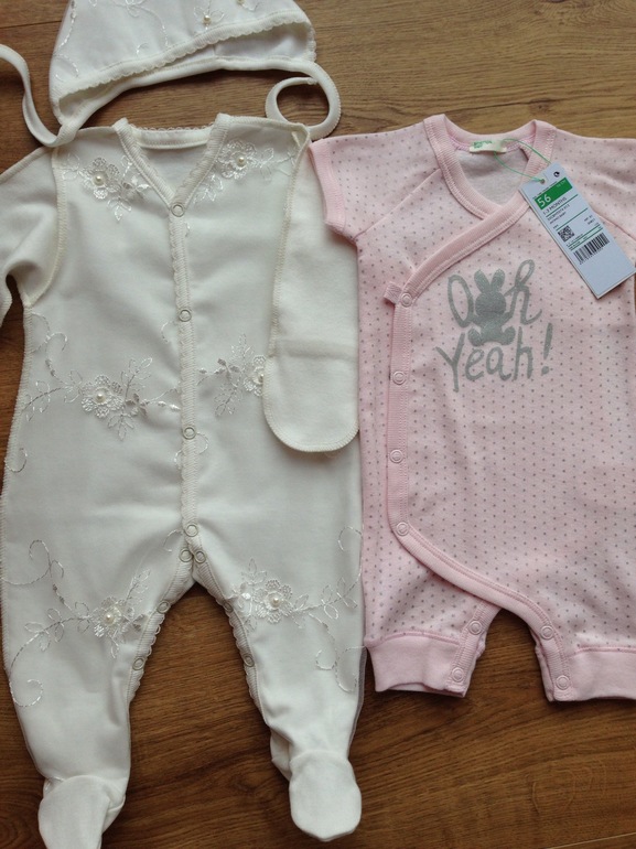 Слип Литтл стар, искала нарядное, но не слишком вычурное, не люблю когда младенец как зефирина утопает в рюшах. Шапочка в комплекте, но вряд ли одену🙈 Или песочник бенеттон на температуру 25-30.