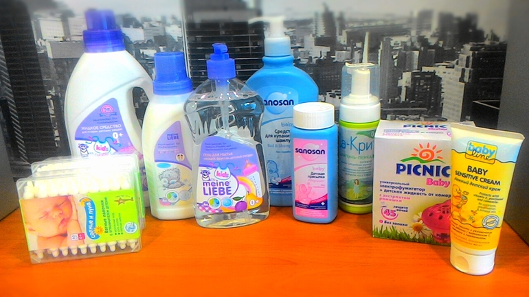 Бытовая химия (еще не вся), товары для купания и ухода за малышом, и кое что для меня