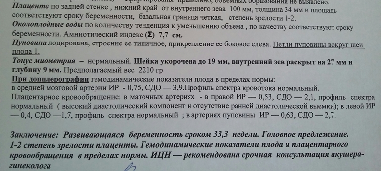 Шейка укорочена до 19мм, внутренний зев раскрыт на 27мм и глубину 9мм. 1-2 степень зрелости плаценты. Угроза преждевременных родов!!!