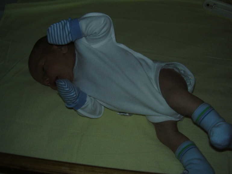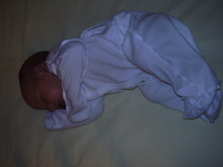 Первый месяц спал вот так. Футболочки и распашонки были мне неудобны, тк поднимались за спинку и мне казалось, что жестко. Соответственно когда холодно на флисе одевали комбез