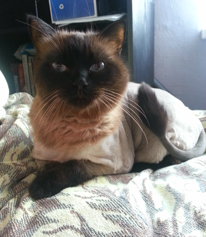И просто вас повеселить- покажу свою кошку после стрижки. Вообще она у меня очень мохнатая, еще и шоколадного цвета- летом ей очень жарко, а сейчас она очень милая и трогательная, как барашек на своих тонких ножках )) зато не жарко и гладиться ей явно намного приятнее- ходит за мной по пятам и подставляет то спинку, то бока