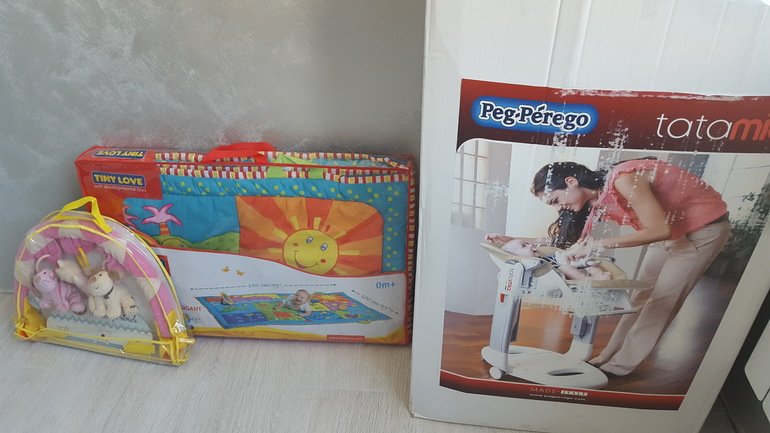 Кроватка, стульчик Татамия, коврик развивающий, игрушки, погремушки все осталось от Ани. На стульчик закажу новый чехол и все.