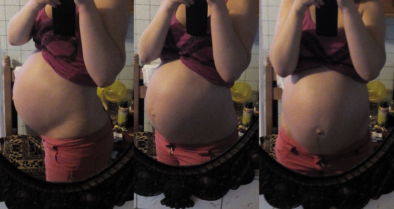 живот стал как мячик))) Лялька пинается будь здоров, стала не только ножками вверху бить, но так же и ручками активно действовать у лобка - даже бугорки стали там видеть😃))) Спать стало еще не удобней - теперь болит спина, но не поясница, а намного выше(((
