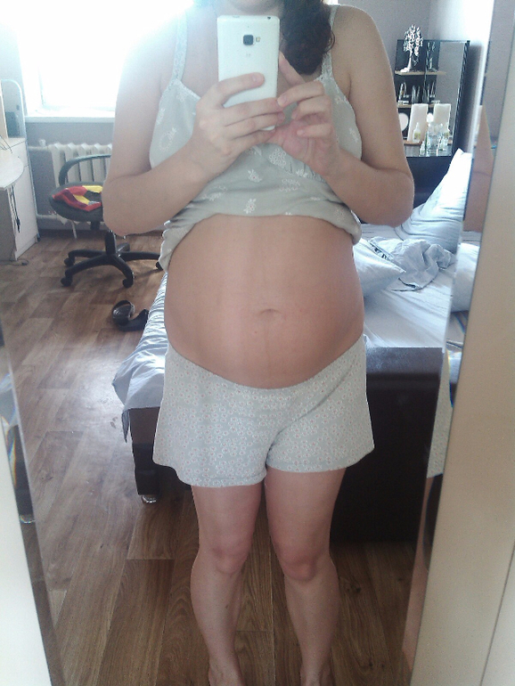 По животу, кажется не растет совсем... Уже с месяц появилась полоска на животе, правда, не очень яркая. Ребенка пинается, теперь уже чувствую ножку))) Иногда ручкой поскребет. Переворачивается все время, теперь чувство, что лежит по диагонали-ножки где-то слева сверху. Грудь все тяжелее становится, иногда из сосков выделяется немного прозрачной жидкости. Ореолы увеличились примерно на сантиметр в диаметре. Интересно, они обратно уменьшатся или нет?