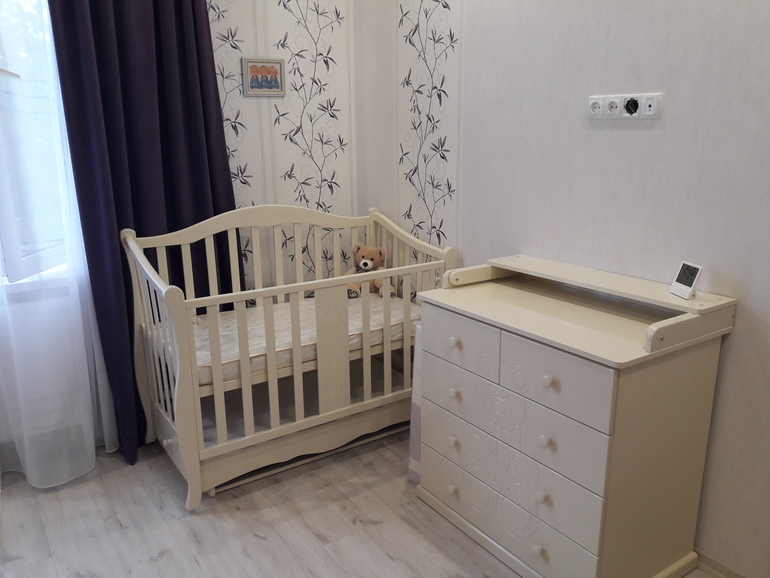Прикупили мебель для нашего солнышка, уже радует наши глаза в спальне)) Кроватка и комодик в цвет слоновой кости с жирафкой и мишкой.