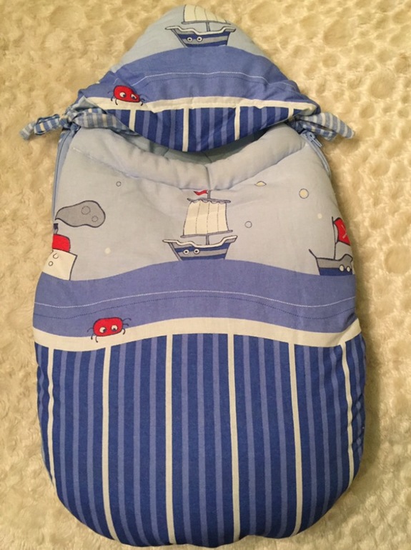 А мы своего пупса выписывали вот в таком конверте морского стиля)))) В жизни даже лучше выглядит, чем на фото. А потом можно как одеяло использовать. Не гламурный, но очень веселенький, на мой взгляд))))
