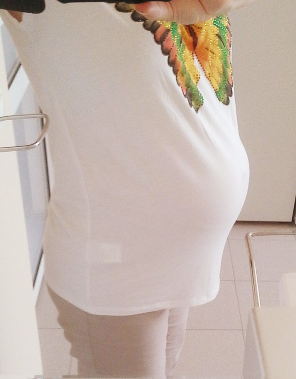 Какой миниатюрный животик. У меня тоже не большой,по крайней мере в сравнении с прошлой беременностью.