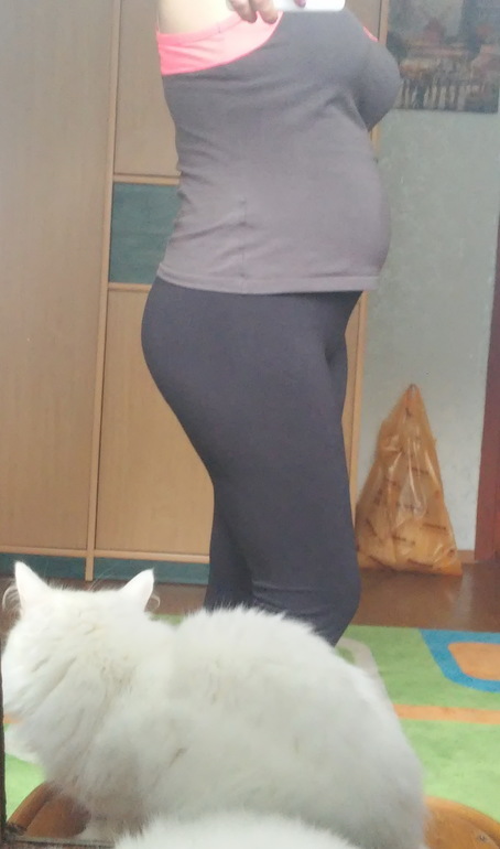 Живот под одеждой всё ещё не виден, тот, кто не знает, и не догадывается)) Мои пенсионеры на работе сваливают все дела на меня: говорят, вот мы на пенсию идём, а ты остаёшься))) А начальник только тихонько посмеивается - он то знает что я раньше их свалю)))