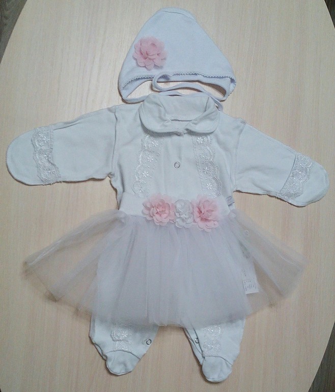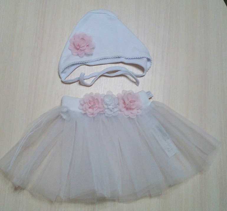 Дело было так, от второго сыночка есть беленький слипик с кружевом, но мне показалось его мало для выписки доченьки и прикупилась вот такая юбочка, плюс шапочка