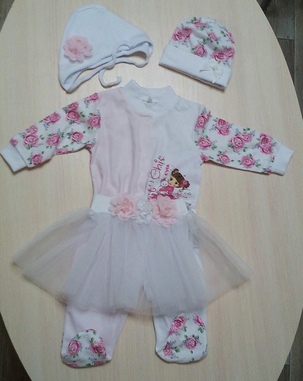 Я уже не знаю, мне нравится больше всего слип с розочками плюс юбочка и шапочка, но меня смущает удобно ли будет в этой юбочке одевать теплый комбез, к слову он будет такой