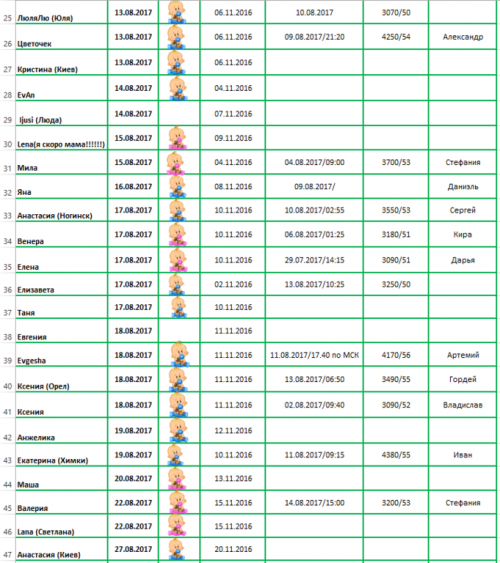 Эльмира /Mom /Анна /moonbootica /Алёна /Инна /Анастасия /Анастасия /Дарья ***Стану мамой в 2017*** /Екатерина /Anastasia_K /Natalka /Настенька /Венера /Елена /Белка /Black Cat /Ольга /Маша Селихова /Evgesha /Алина /Анна( Я буду дважды мамой в 2017 году) /EvAn /Мила /Каролина /КСЮ /Евгения /Анастасия /Тома Тома /Светланочка /vikka /Зария /Оличка /Таня /ljusi /Наталья Натальевна /Марья /Настена /Ксения /Кристина /Лесенок /Кристина /Ирина /Lena(я скоро мама!!!!!!) /Яна /Dashutka /Аврора /Анастасия /Людмила /Елена /Елена /КоТёНоЧеГгГ /Ayah /Nutella /
